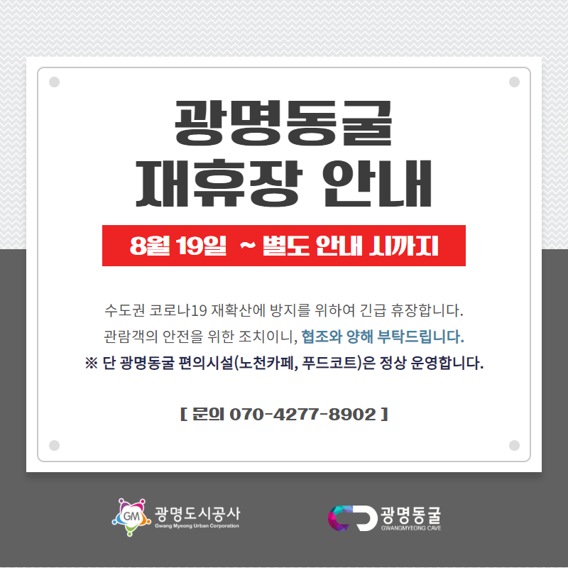 단, 광명동굴 노천카페, 푸드코트는 정상 운영합니다.(운영시간: 9:00~18:00)
