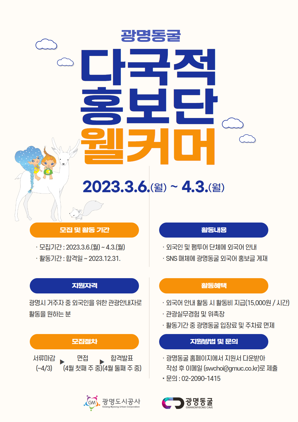 광명동굴에서는 해외 관광객 대상으로 외국어 안내 서비스를 제공하여 관광 만족도를 높이고 SNS를 통하여 광명동굴을 홍보할 2023년 광명동굴 웰커머 8기를 모집합니다.