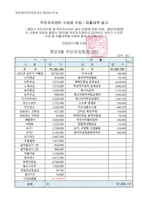 2025년 상반기 하안3동 주민자치센터 수강료 수입 지출 내역 공고