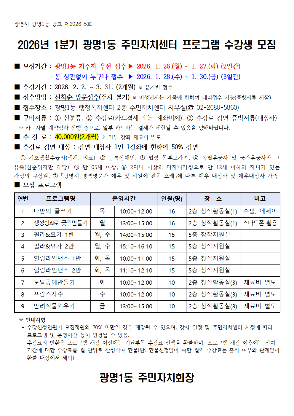 2026년 1분기 광명1동 주민자치센터 프로그램 수강생 모집 공고