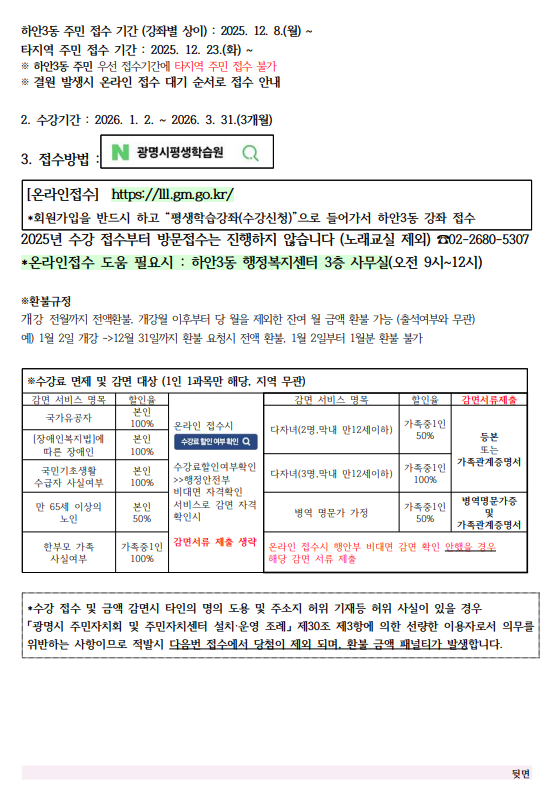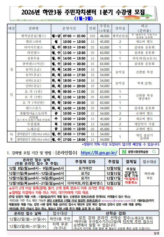 바로가기 패스 및 공유하기 및 탭메뉴 영역 홈 우리동소식 모집공고 영역 프린트 모집공고 2026년 1분기 하안3동 주민자치센터 프로그램 수강생 모집 공고 게시판 상세보기 등록일시 2025-12-11 15:59:16 파일 2026년 1분기 주민자치센터 수강생 모집.hwp (download 17, 224 KB, application/haansofthwp) 2026년 1분기 주민자치센터 수강생 모집.pdf (download 35, 203 KB, application/pdf) 목록