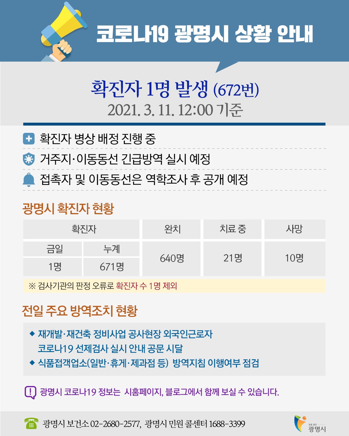 코로나19 광명시 672째 확진자 발생 안내 3월 11일(목)