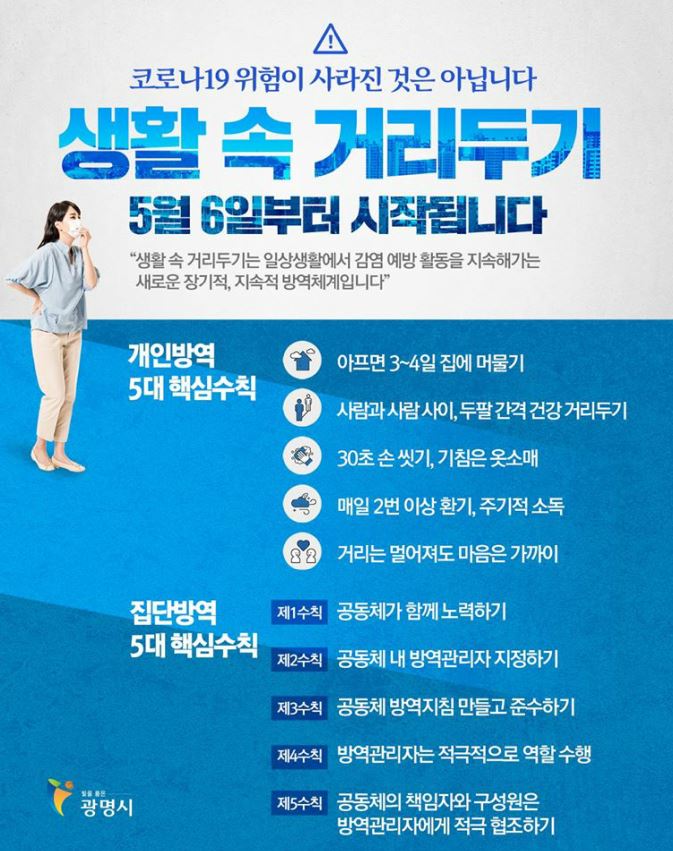 5월 6일부터 '사회적 거리두기'에서 '생활 속 거리두기'로 조심스럽게 이행합니다. 국내 코로나19 첫 발생 후 100여일 만에 방역과 일상이 조화를 이루기 시작하는 것입니다. 있습니다. 하지만 코로나19 위험이 사라진 것은 아닙니다. 해외유입 환자와 감염 경로를 알 수 없는 환자가 여전히 존재 합니다. 시민 여러분들께서는 한분 한분, 방역 책임자가 되어 생활 속 방역수칙을 준수해주시고, 소중한 일상으로 돌아가기 위한 준비에 동참해 주시기 바랍니다. |