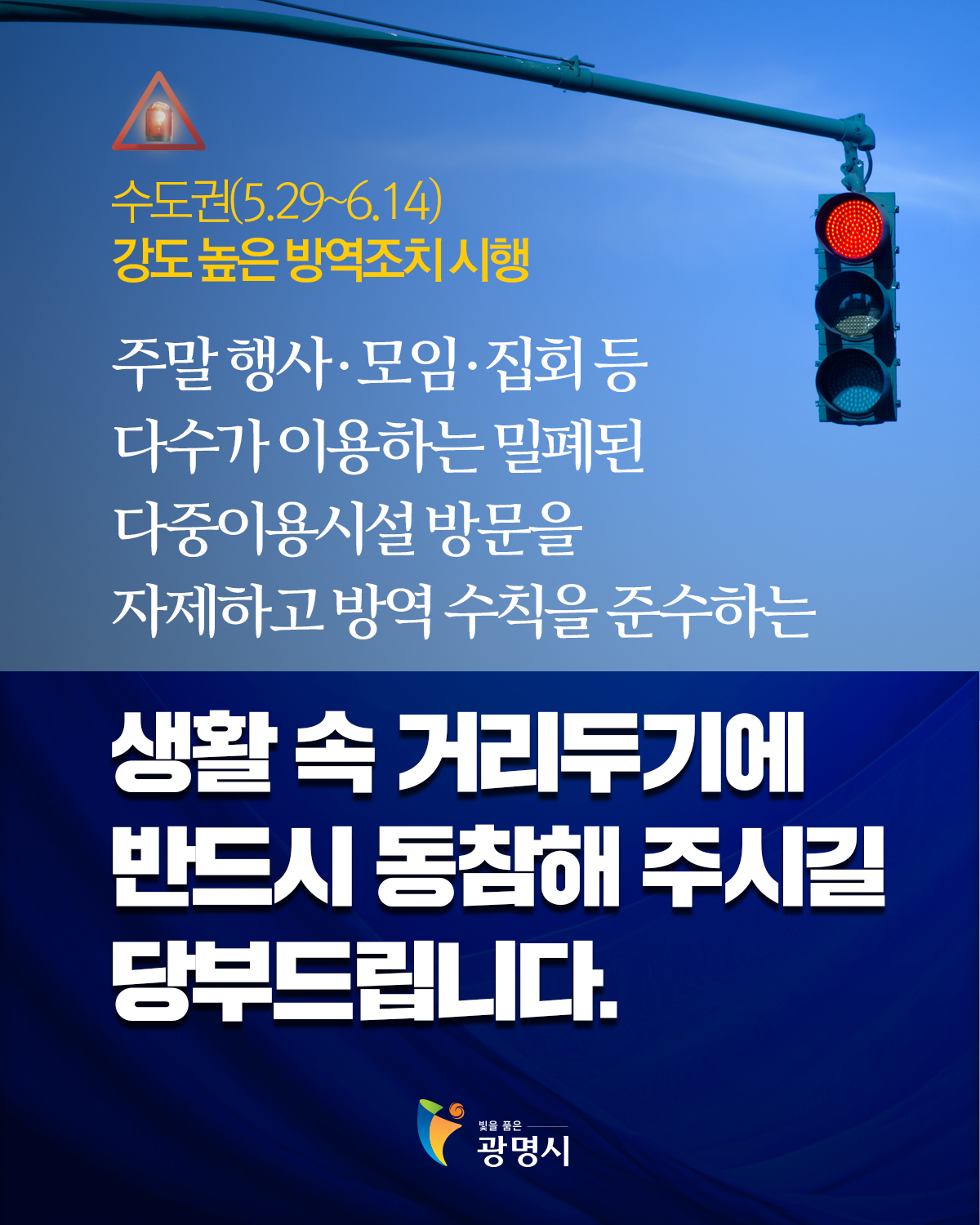 수도권(5.29~6.14) 강도 높은 방역조치 시행으로 우리 모두가 더 엄격하게 생활 속 거리두기와 생활방역수칙을 준수해야 할 때 입니다.