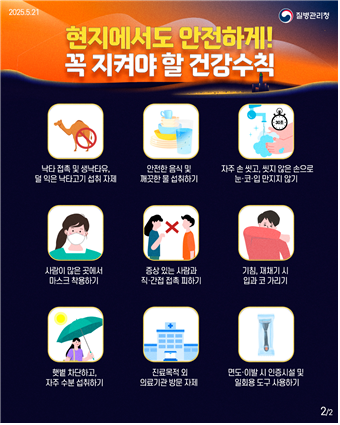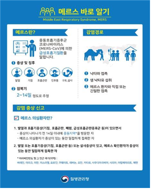 - 사우디아라비아 등 중동지역에서 입국 후 14일 이내에 발열 및 호흡기 증상(기침, 숨가쁨 등) 발생 시 질병관리청 콜센터(1339)로 즉시 신고