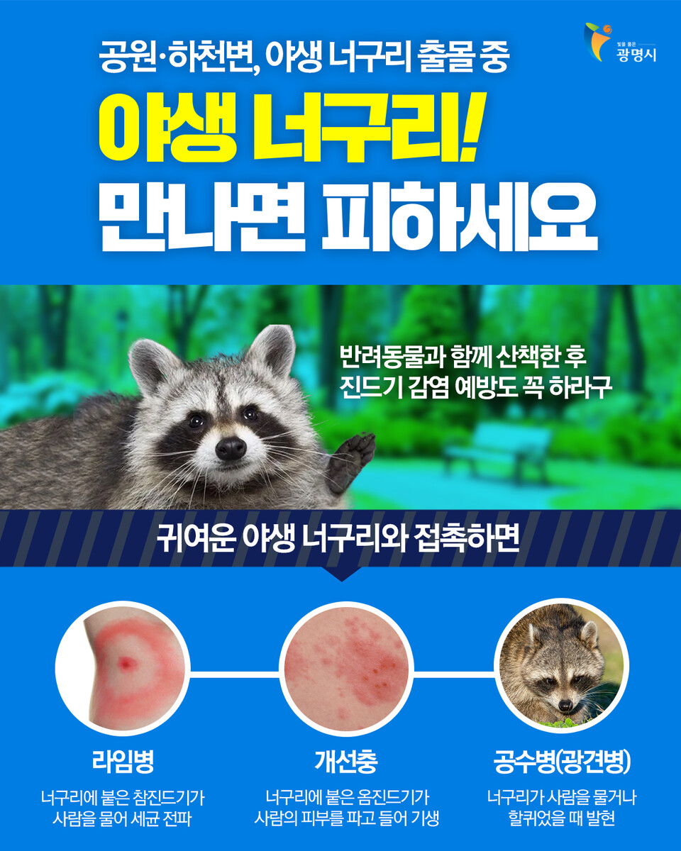 ⚠ 특히, 너구리는 피부병(개선충증) 및 공수병(광견병) 등의 감염병을 전파할 위험이 있으며, 너구리 몸에 붙어있는 진드기가 반려동물을 거쳐 사람에게까지 옮겨와 중증열성혈소판감소증후군(SFTS) 같은 진드기 매개 감염병을 유발할 수 있습니다.