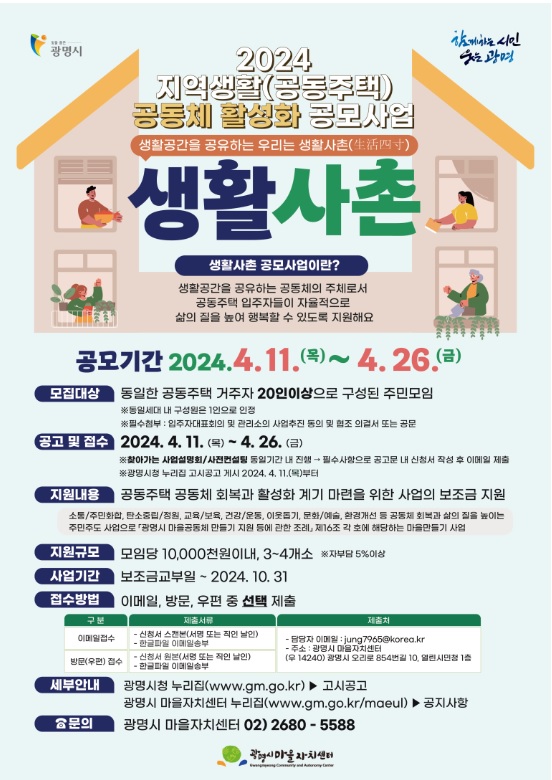 | 제목 | 「2024년 광명시 '생활사촌' 지역생활(공동주택)공동체 활성화 공모사업」접수안내 | ||