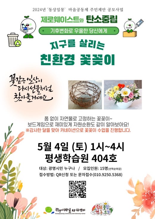 2024 마을공동체 주민제안 공모사업 '동상일몽'의 탄소중립연구모임 공동체의 첫 사업인 '지구를 살리는 친환경 꽃꽂이' 를 5월 4일 오후 1시~4시 평생학습원 404호에서 진행합니다. 카네이션 꽃꽂이와 더불어 보드게임도 준비했으니, 많은 시민분들의 관심과 참여를 부탁드립니다 ^^ |