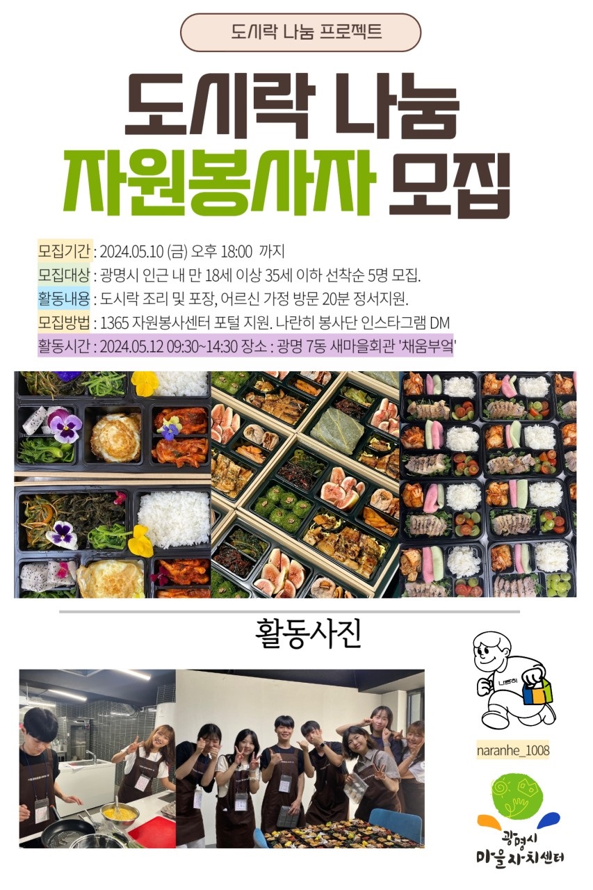 마을자치일정표 상세보기 - 지역(동이름), 카테고리, 제목, 행사일정, 작성자, 등록일자, 조회수, 내용 순으로 제공 제목 광명시 공동체 '나란히' 도시락 나눔 자원봉사자 모집. 등록자명 관리자 발행일자 2024-04-30 내용 파일 첨부파일이 없습니다. 이전글 광명시, 마을공동체 활성화로 도시의 회복탄력성 기틀 마련 다음글 광명시 탄소중립연구모임 '지구를 살리는 친환경 꽃꽂이' 진행 목록