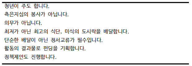 치솟는 물가에 제철과일의 가격도 만만치 않습니다. 도시락에 과일을 포함 시키고 싶어도 구성단가에 40%에 달하는 과일 가격이 부담스럽지요. 이에 '나란히'는 #광명시 #건강과일지원사업 의 수혜자를 어린이와 임산부에서 독거노인까지 확대할 것을 제안하고자 합니다. 활동의 제약에 물러서지 않고 적극적으로 타계해 나가려는 의지가 돋보이네요.