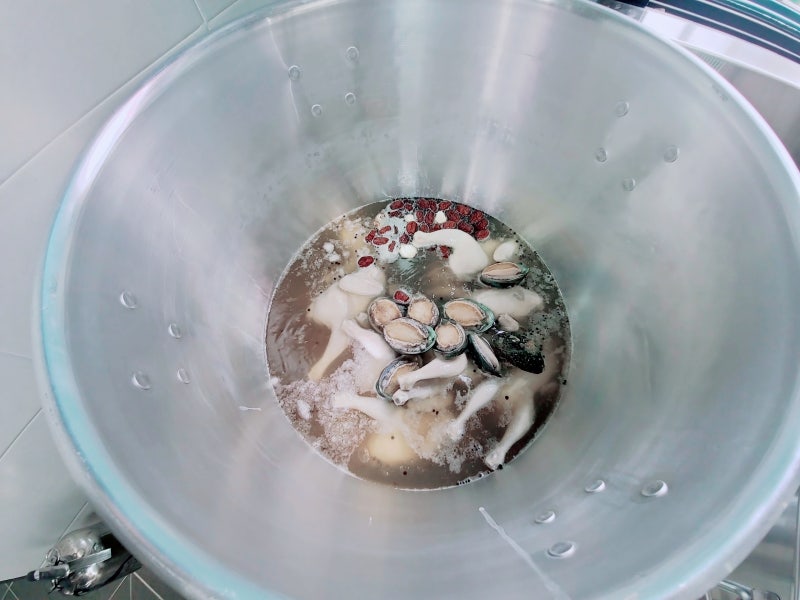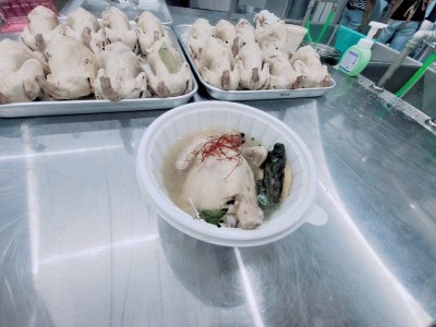 잘 익은 삼계탕을 예쁘게 담아냅니다. 풍미 좋은 버섯 밥도 고슬고슬 잘 지어졌습니다. 날씨를 고려해 전복의 내장은 일일이 발라내었지요. 빨간 실고추와 자연산 송이 고명이 한껏 멋이 납니다.