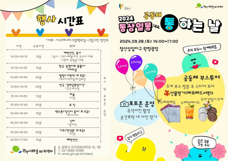 지난 2024년 9월28일 토요일 늦은2시~5시 철산 상업지구 원형광장에서 큰 잔치가 있었습니다. 알고 계셨나요? 광명시에는 많은 공동체가 있습니다. 특히, 올해 4월부터 30여개의 #공동체 가 #광명시마을자치센터 의 지원을 받아 활발하게 사업을 펼치고 있는데요. 이 날은 공동체 “통” 하는 날로 공동체들이 연대하여 지역 주민과 함께 하는 큰 찬지가 있었습니다.