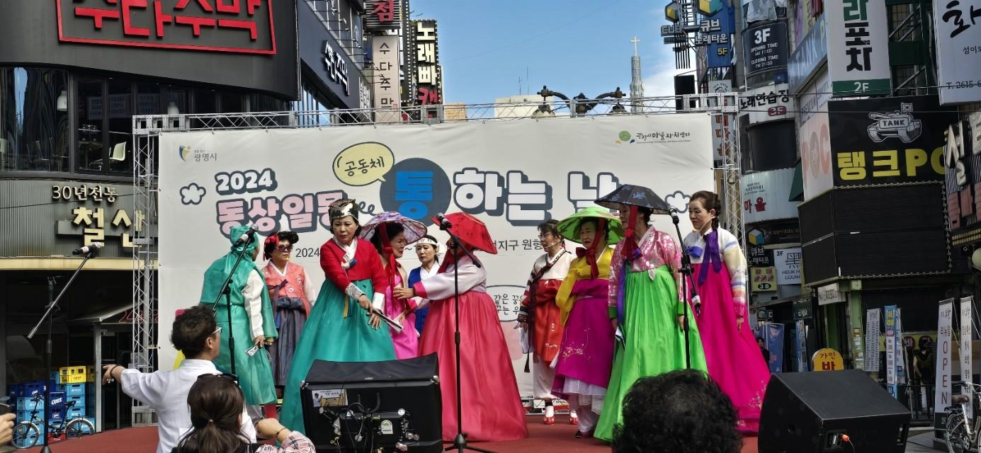 2024년 9월28일 토요일 철산상업지구 원형 광장에서는 [광명시 마을자치센터 공동체“통”하는 날]의 개막 선언이 있었습니다. 사회는 [지구애나비 그림책모임 그림그린]팀의 정연주 활동가였습니다. [#지구애나비 그림책모임 그림그린]팀은 그림과 글, 책을 소통의 수단으로 삼아 그림책 제작을 하고 있습니다. 그림책 안에는 마을과 마을사람들의 이야기가 옴니버스 형태로 실릴 예정입니다. 플라스틱 도마 사용 대신 나무 도마 사용으로 #탄소중립 을 실천하자는 [ #그린나래봉사단 ]의 우수미 대표, 독거노인에게 고급지고 아름다운 미식 도시락을 전달하는 청년 봉사단 [#나란히 ]팀의 유병훈 대표는 축사를 통해 “작은 공동체로 모여 함께 성장하고 즐기는 시간이 되었으면 한다.”고 말했습니다. 철산2동 주민자치회로 구성되어 지역 주민과 따뜻한 활동, 나눔을 하는 [따마공] 팀의 창극도 있었고요. 극단 캐스팅의 연극 “경로당 폰팅사건”도 공연되었습니다. 음악 공연도 시민의 발걸음을 잡았지요. 원형 광장에서는 다양한 공동체 활동 체험 부스가 운영되기도 했습니다.