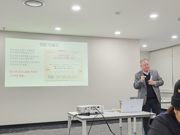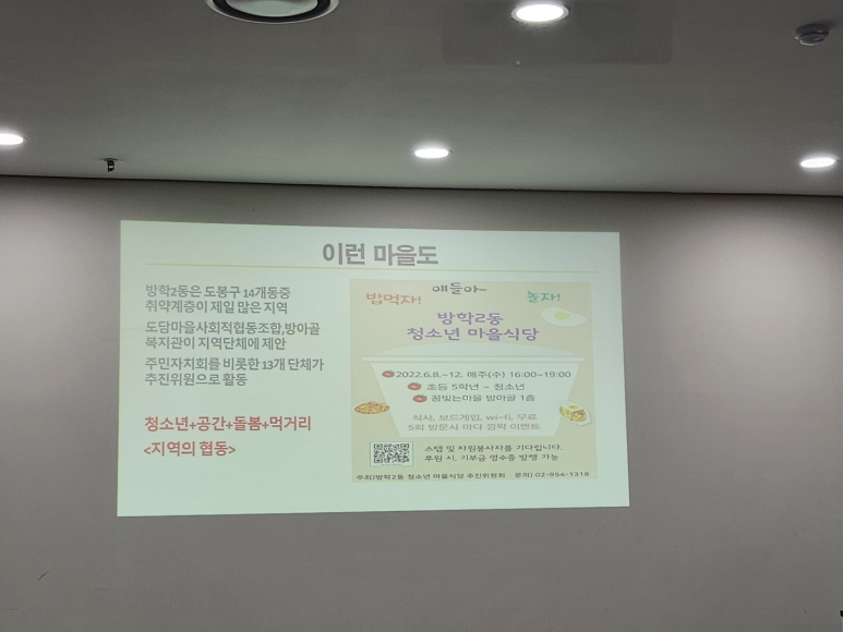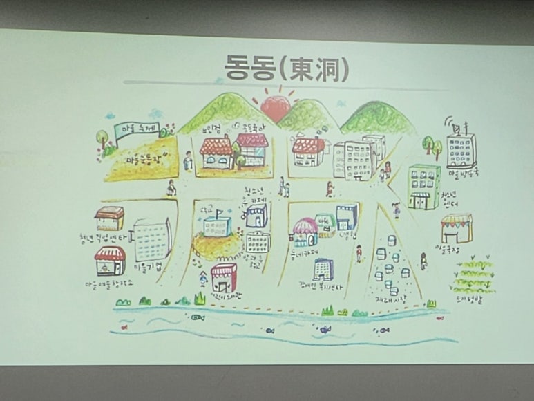강사님은 다양한 마을의 공동체 활동을 소개해 주셨습니다. 전남 해남군의 밥상공동체/ 안산사동의 다문화를 아우르는 <의사소통, 학교적응, 돌봄 등>/마을 어르신을 위한 <마을연금>제도를 실시하는 태안군의마을/방학2동의 <청소년+공간+돌봄+먹거리> 사업......