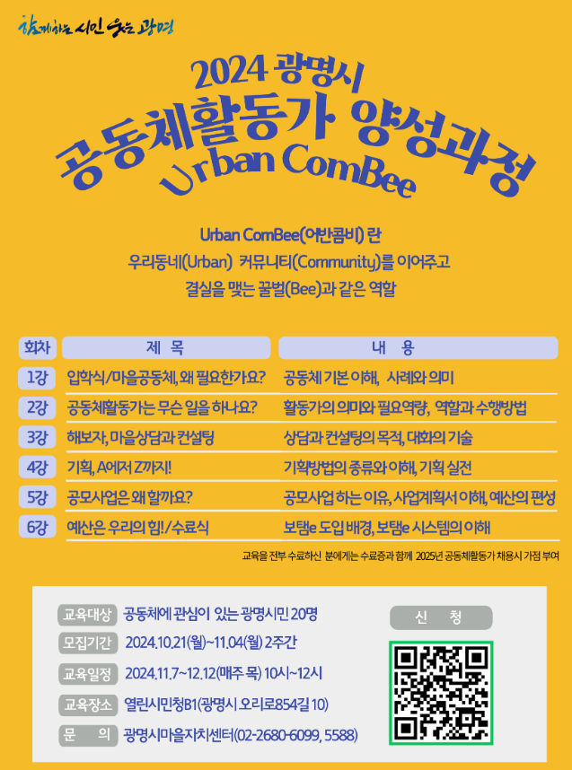 이후, [광명시 어반 ComBee 공동체 활동가] 양성 교육은 아래와 같이 운영됩니다. 2강 공동체 활동가는 무슨 일을 하나요? (활동가의 의미와 필요역량, 역할과 수행방법) 3강 해보자, 마을상담과 컨설팅 (상담과 컨설팅의 목적, 대화의 기술) 4강 기획, A에서 Z까지! (기획방법의 종류와 이해, 기획 실전) 5강 공모 사업은 왜 할까요? (공모 사업하는 이유, 사업계획서 이해, 예산의 편성) 6강 예산은 우리의 힘!, 수료식 (보탬e 도입 배경, 보탬e 시스템의 이해) 앞으로 6주후, 배출된 마을 활동가들이 우리 마을 공동체의 충실한 가이드 역할을 충분히 해내길 바랍니다. 공동체 활동을 원하시는 광명시민 여러분 광명시마을 자치 센터는 항상 열려 있습니다. [광명시 어반 ComBee 공동체 활동가]와 활동을 시작해보십시오. [출처] [현장스케치] 마을공동체 활동가 양성과정|작성자 광명시공활센터