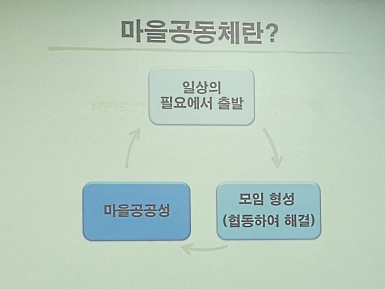 마을공동체란 일상의 필요에서 출발하여 모임을 형성하고 마을 공공성을 가지고 활동하는 것 이라고 정의 해주셨네요. 마을은 걸어서 10~15분 정도의 생활 단위이며, 주민들이 관계를 맺을 수 있는 정서적/물리적 생활단위 라고 합니다. 우리는 이 마을에서 서로 관계를 맺고 살며, 이 관계가 바로 공동체의 출발인 것입니다. 따라서 우리 삶의 마을공동체 활동은 선택이 아니라 필수이며, 이를 통해 지역의 변화를 이끌어 내는 것이 마을 공동체의 궁극적인 필요라고 하셨습니다.
