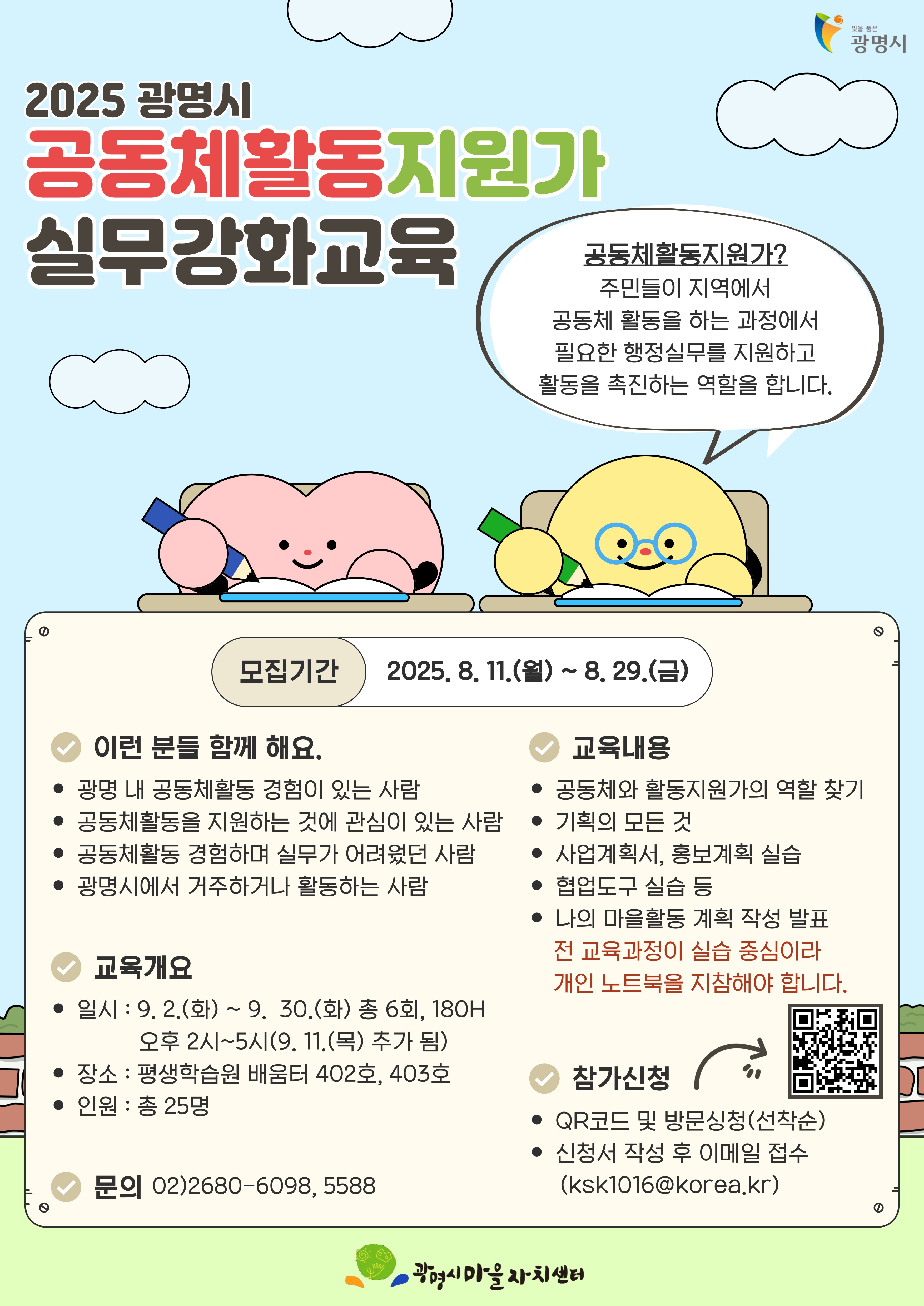 광명시(시장 박승원) 마을자치센터는 오는 9월 2일부터 30일까지 ‘2025년 공동체활동지원가 실무 강화 교육’을 운영한다.