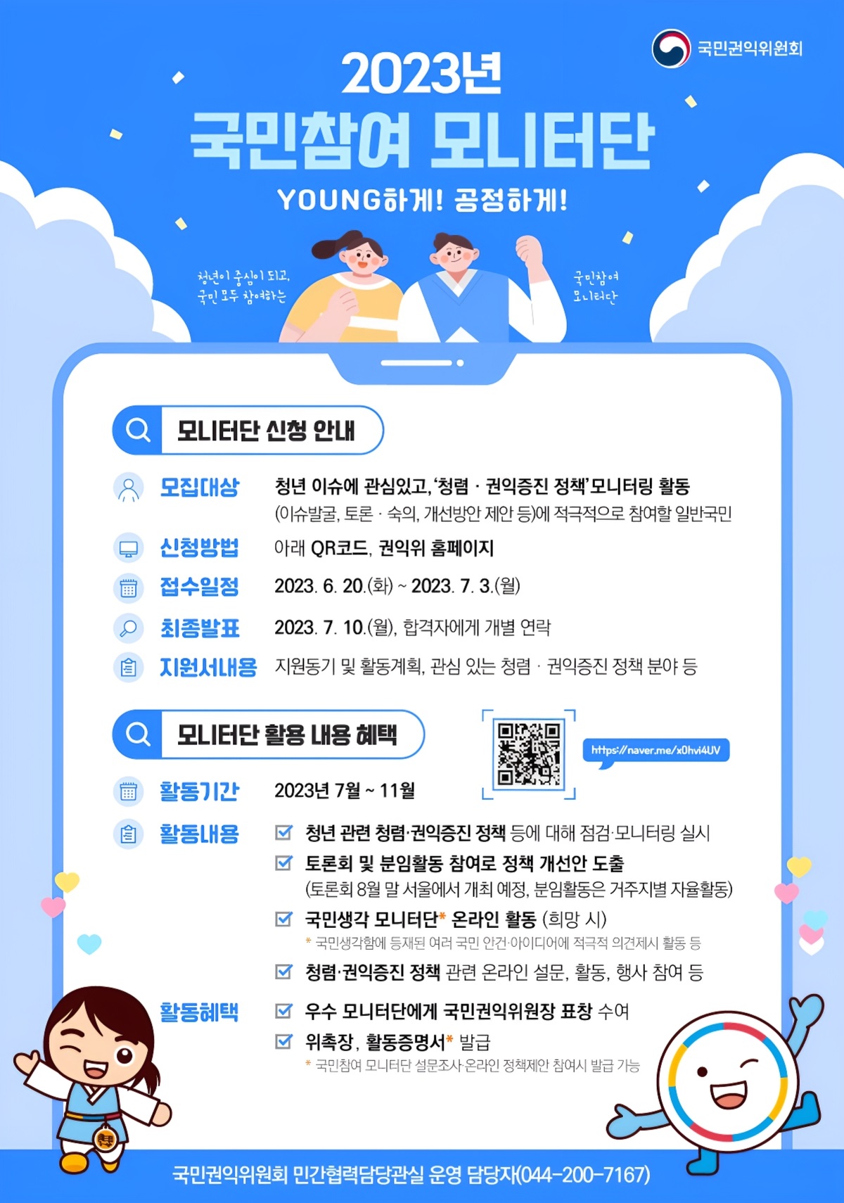국민권익위원회는 청렴정책·권익증진정책에 국민읜 직접 참여를 강화하고, 국민읜 관심도를 제고하기 위해 매년 '국민참여 모니터단'을 구성하여 운영해오고 있습니다. 2023년 국민참여 모니터단 모집 계획을 알려드리오니, 많은 참여 부탁드립니다.