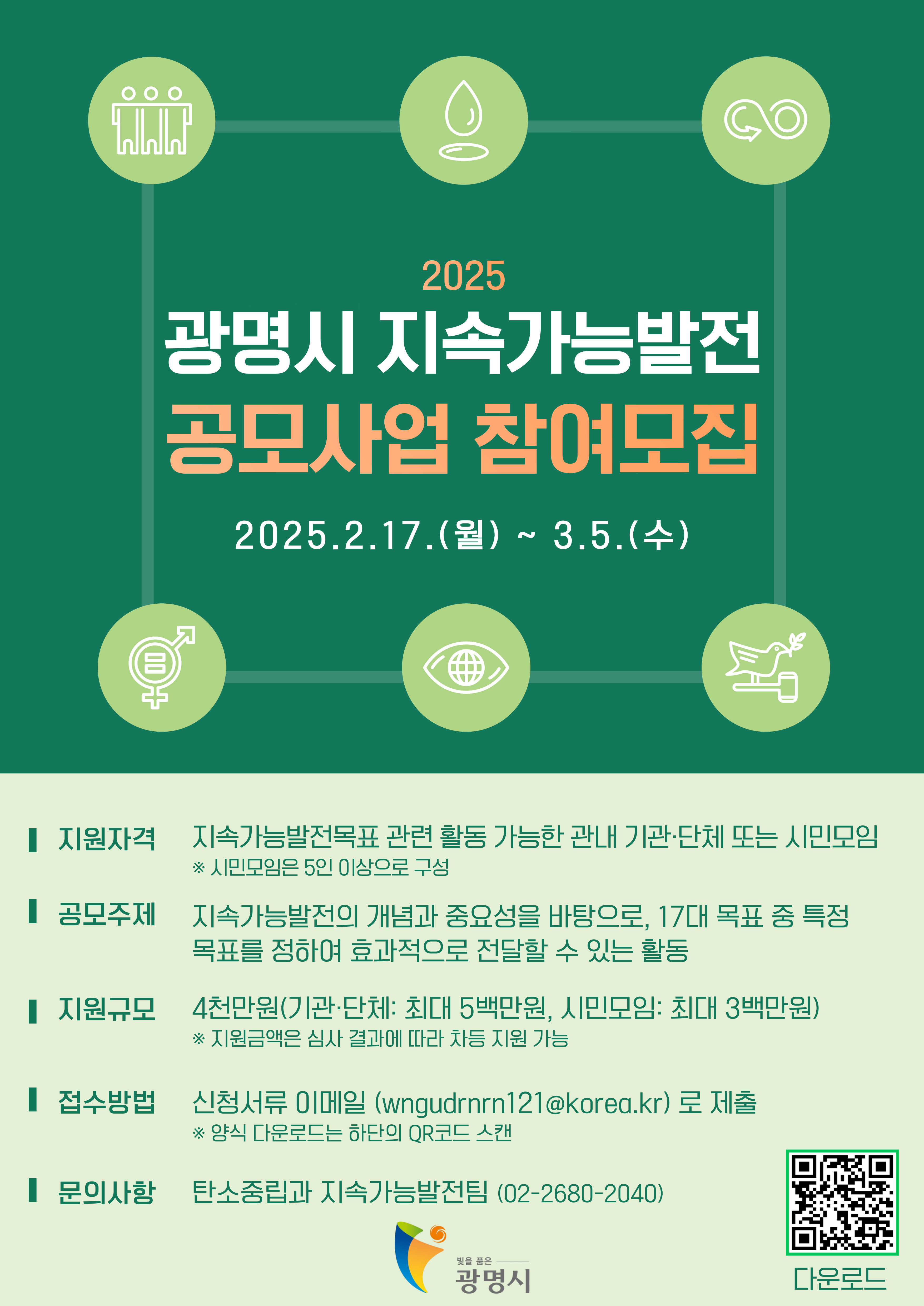 1. 사업개요 가. 사업명: 광명시 지속가능발전 공모사업 나. 사업예산: 총 40,000천원 다. 사업기간: 2025. 3. ~ 10. 라. 지원내용 (주제1) 지속가능발전목표의 개념과 필요성을 널리 확산시킬 수 있는 활동 (주제2) 지속가능발전목표 중 특정 목표를 선택하여 이를 효과적으로 전달할 수 있는 활동 마. 지원대상 - 관내 기관 및 단체: 최대 5백만원(자부담 5% 필수) - 시민모임(5인이상): 최대 3백만원