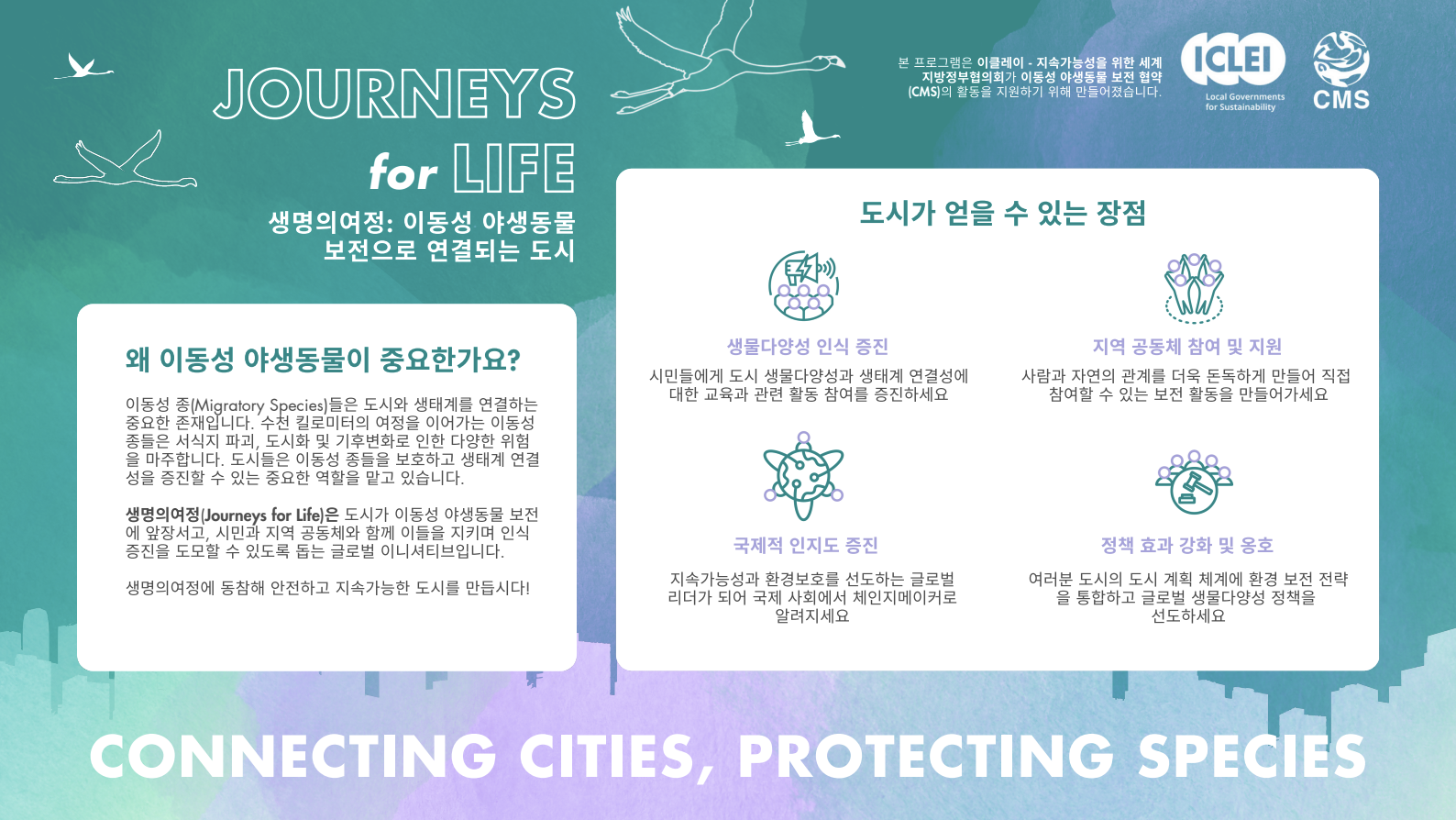 이클레이는 이동성 야생동물 보전을 위한 도시간 협력을 강화하는 '생명의여정'을 발족했습니다. 이클레이 도시생물다양성센터와 EAAFP가 그 첫 번째 역량강화 교육을 개최했다고 하는데요. 철새 보전에 대한 도시의 흥미로운 이야기를 들어보세요. 한국의 연천군도 참여했다고 합니다!