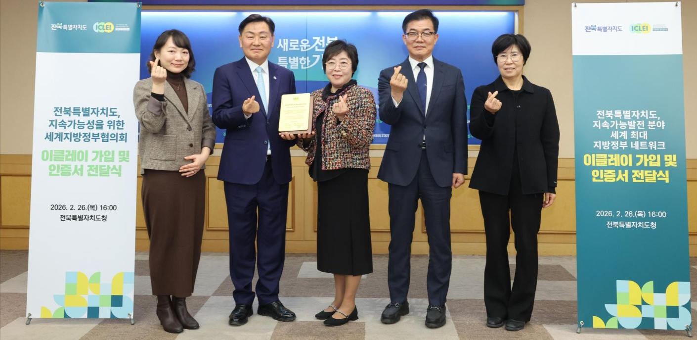 2026년 첫 이클레이 가입 국내 지방정부는 바로 전북특별자치도입니다. 이로써 이클레이 한국회원은 광역 15곳, 기초 42곳 등 총 57개 지방정부로 확대되었습니다. 전북특별자치도는 이번 가입을 계기로 이클레이와 협력하여 탄소중립, 생태복원, 순환경제 등 주요 지속가능발전 정책을 국제 네트워크와 연계하고, 정책 교류와 협력을 더욱 확대해 나갈 계획입니다. 2월 26일 개최된 가입 인증서 전달식 및 협력 간담회를 살펴보세요.