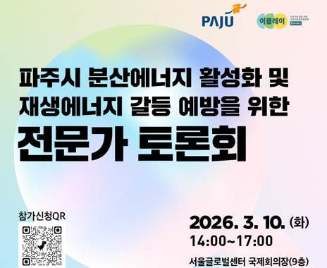3월 10일, 서울글로벌센터에서 파주시와 이클레이 한국사무소가 '파주시 분산에너지 활성화 및 재생에너지 갈등 예방을 위한 전문가 토론회'를 개최합니다. 이번 토론회는 지역 특성과 주민 수용성을 고려한 재생에너지 전략 수립에 참고·적용할 수 있는 좋은 기회가 될 것입니다. 공무원 교육시간 인정도 가능하니 이번 토론회에 오셔서 뜻깊은 논의의 장에 함께해 주세요.